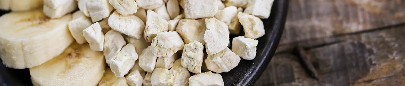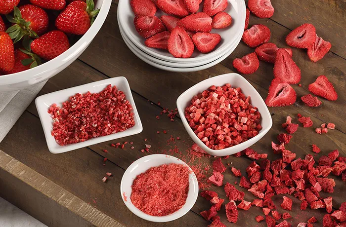 Freeze-dried food is made when frozen raw materials are placed in a refrigerated vacuum system and, without thawing, are dehydrated. The ice in the product is sublimated into water vapor. During the freeze-drying process, cell structure remains intact. This results in high-quality ingredients with the same color, shape, flavor, and nutrients of fresh product.