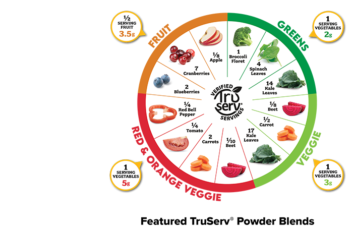 TruServ® is a program that exclusively connects our whole food fruit, vegetable, and greens powders and pieces to USDA-recommended fruit and vegetable servings to answer the call for convenient, better-for-you products. Our TruServ® whole food powders and pieces are a part of the TruServ Verified® label claim verification program pioneered by our sister company FutureCeuticals.
